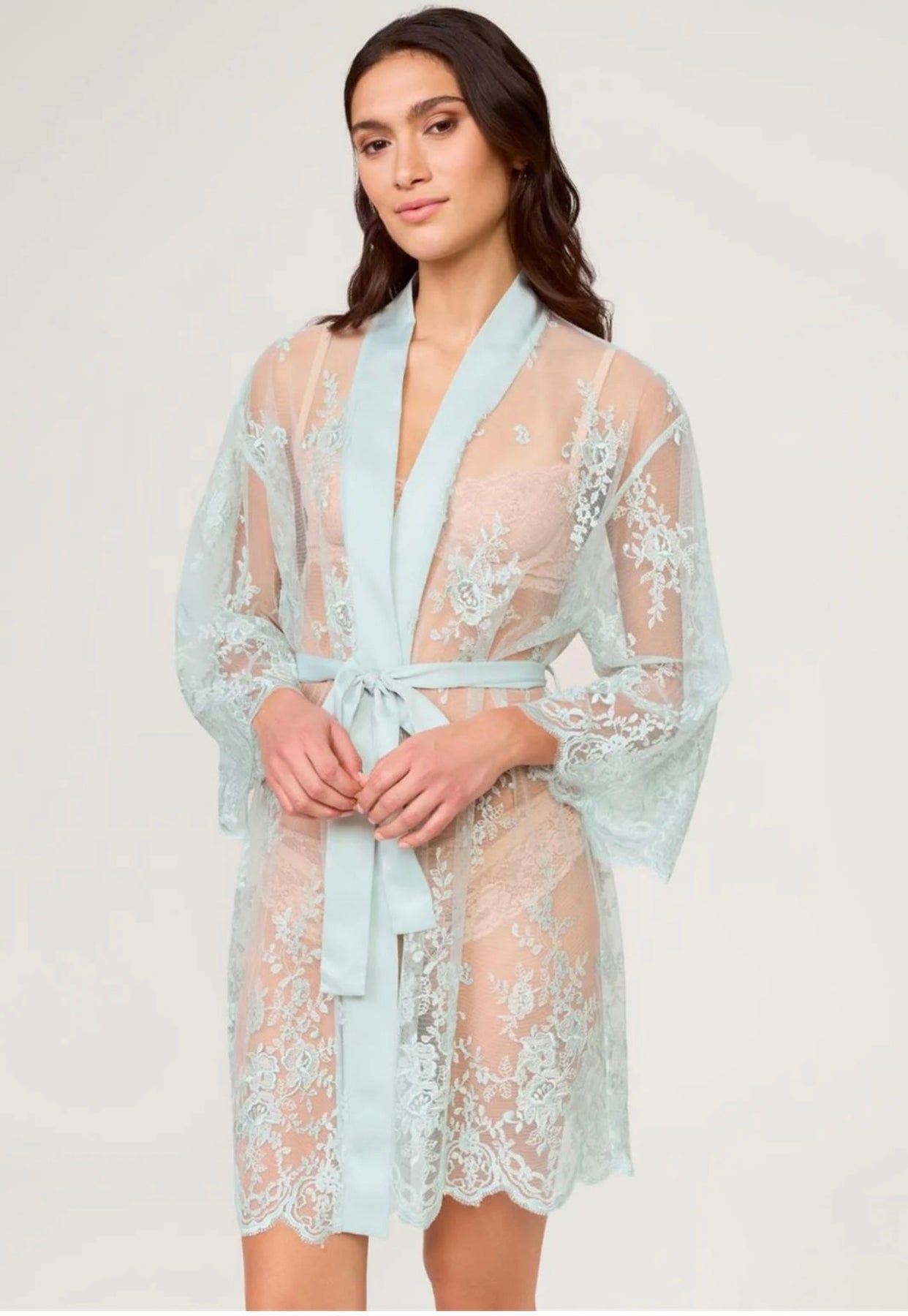 This delicate allover embroidery cover-up is perfect for layering over any lingerie piece. Pair it best with our Darling Chemise. Details: • Allover embroidered netting • Adjustable belt ties center front • Ethically made • Available in XS/S – M/L – XL